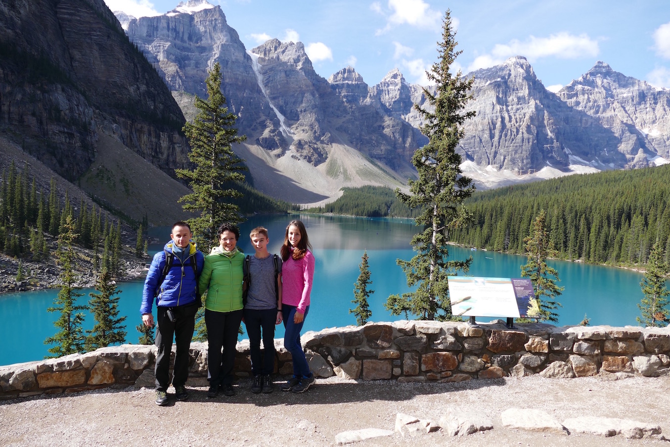 Wir sind Familie Opolka aus Regensburg. Unsere Familie besteht aus Heinz und Petra Opolka und Maja und Felix Opolka. Im Bild auf der linken Seite sind wir während unseres Kanada-Urlaubs im August 2015 zu sehen. Es zeigt uns vor dem Moraine-Lake, dem bekannten Gletscher-See im Banff-Nationalpark.